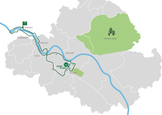 In neuem Gewand zeigt sich die beliebte AOK PLUS-Tour nach Radebeul: Bevor die Radler ans Elbufer gelangen, ziehen sie diesmal einen Bogen durch die Südvorstadt. Über die Flügelwegbrücke gelangen sie dann nach Übigau und folgen dem Elberadweg in den malerischen historischen Dorfkern von Altkaditz. Nahe am Fluss geht’s entspannt und meist autofrei bis zur Festwiese Radebeul; dort lädt ein Verpflegungspunkt zur ausgiebigen Rast ein. Auf der anderen Elbseite prägt eine üppig grüne Wiesen- und Auenlandschaft das Bild, bevor die Kräne des Alberthafens und die Sportanlagen des Ostrageheges in Sicht kommen. Zum Finale leuchten die grünen Shirts an Synagoge, St. Benno-Gymnasium, Gläserner Manufaktur und Stadion.