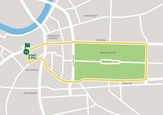 Die jüngsten Radler und ihre Familien umrunden diesmal die grünen Lungen im Herzen der Stadt. Angeführt von der Polizei, passieren sie nach dem Start am Altmarkt zunächst das Stadtmuseum und die Gläserne Manufaktur. Auf der Stübelallee geht es geradewegs bis ans östliche Ende des Großen Gartens, der seinem Namen mit rund zwei Quadratkilometern Fläche alle Ehre macht. Die prächtige Hauptallee, die an seiner „Schmalseite“ mündet, erlaubt einen reizvollen Blick ins Innere des beliebten Parks. Kurz nach dem Bahnhof der Parkeisenbahn biegt der bunte Pulk erneut rechts ab und rollt vorbei an Carolasee, Zoo und Blüherpark Richtung Rathaus. Von dort ist es nur noch ein Katzensprung bis zum Ziel.